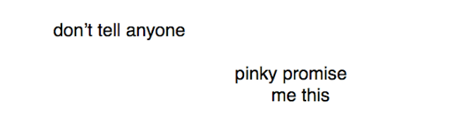 Stumbled upon Ana Carrete’s chapbook/piece entitled “pinky promise me this” just today on Twitter. You should check it out! Click here to read/download a PDF version. You can also purchase a copy of her recent book Baby Babe using the links below.