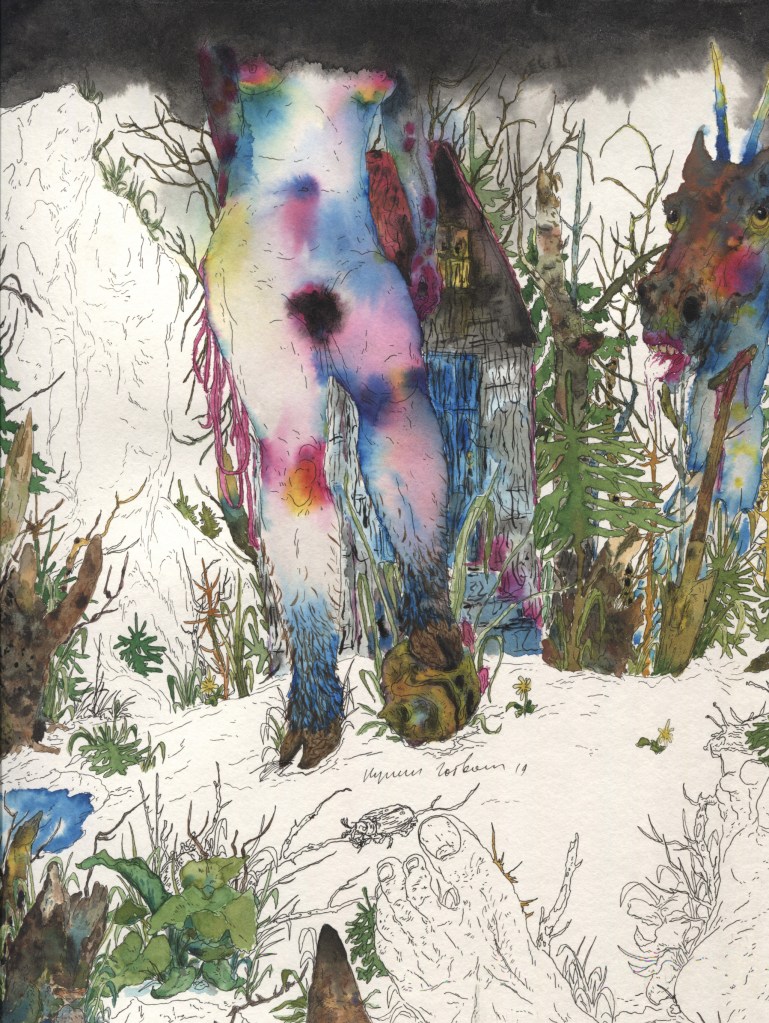 The fragile meditative collage compositions capture daily rituals and new consumer habits. It is also noteworthy that in addition to the techniques and media there is also a very important conceptual layer. The artist includes elements of dreams and psychoanalytic symbolism into the depicted reality.